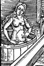 Als ich nach Abbildungen von Badeszenen suchte, um diese Seite zu beleben, stolperte ich über das Thema der "Bathseba im Bad", das offebar v.a. vom Mittelalter bis ins 17. Jh. des öfteren gemalt wurde. Es fiel sofort auf, daß spätmittelalterliche Darstellungen Bathseba in einem Holzzuber sitzend zeigen, während man auf Abbildungen des 16. und 17. Jh. nur Bathsebas sieht, die neben einem Springbrunnen sitzen, neben einer großen Metallschüssel, oder von einer Dienerin die Beine mit einem Tuch abgerieben bekommen. Eine völlig ins Wasser getauchte Bathseba konnten sich Künstler des 17. Jh. offenbar nicht vorstellen was die Ausführungen oben zu bestätigen scheint. Wobei man aber auch nicht übersehen darf, daß Renaissance und Barock das Thema gern zum Vorwand nahmen, um nacktes Fleisch darstellen zu dürfen, was in einem Zuber nicht gar so leicht möglich ist aber, wie Dürer (Bild oben) vorführt, auch nicht unmöglich.