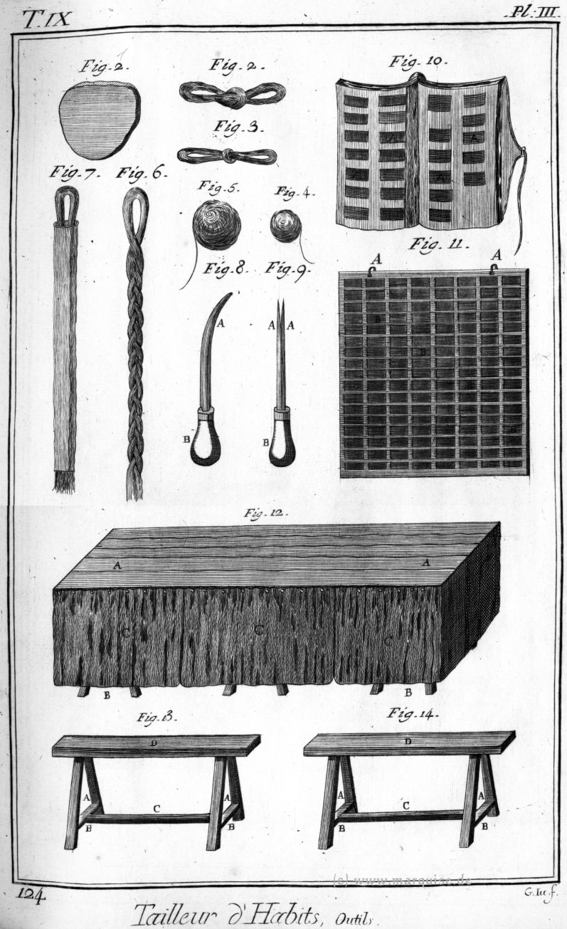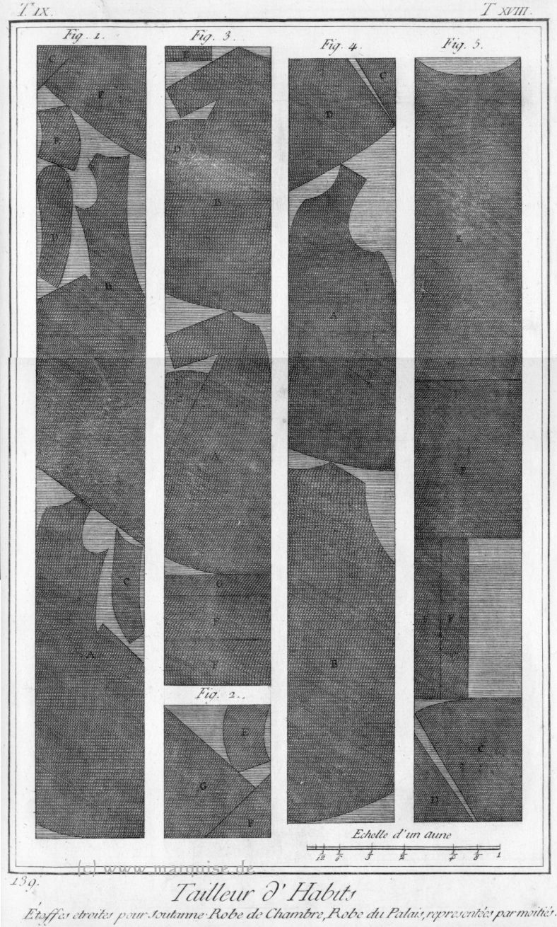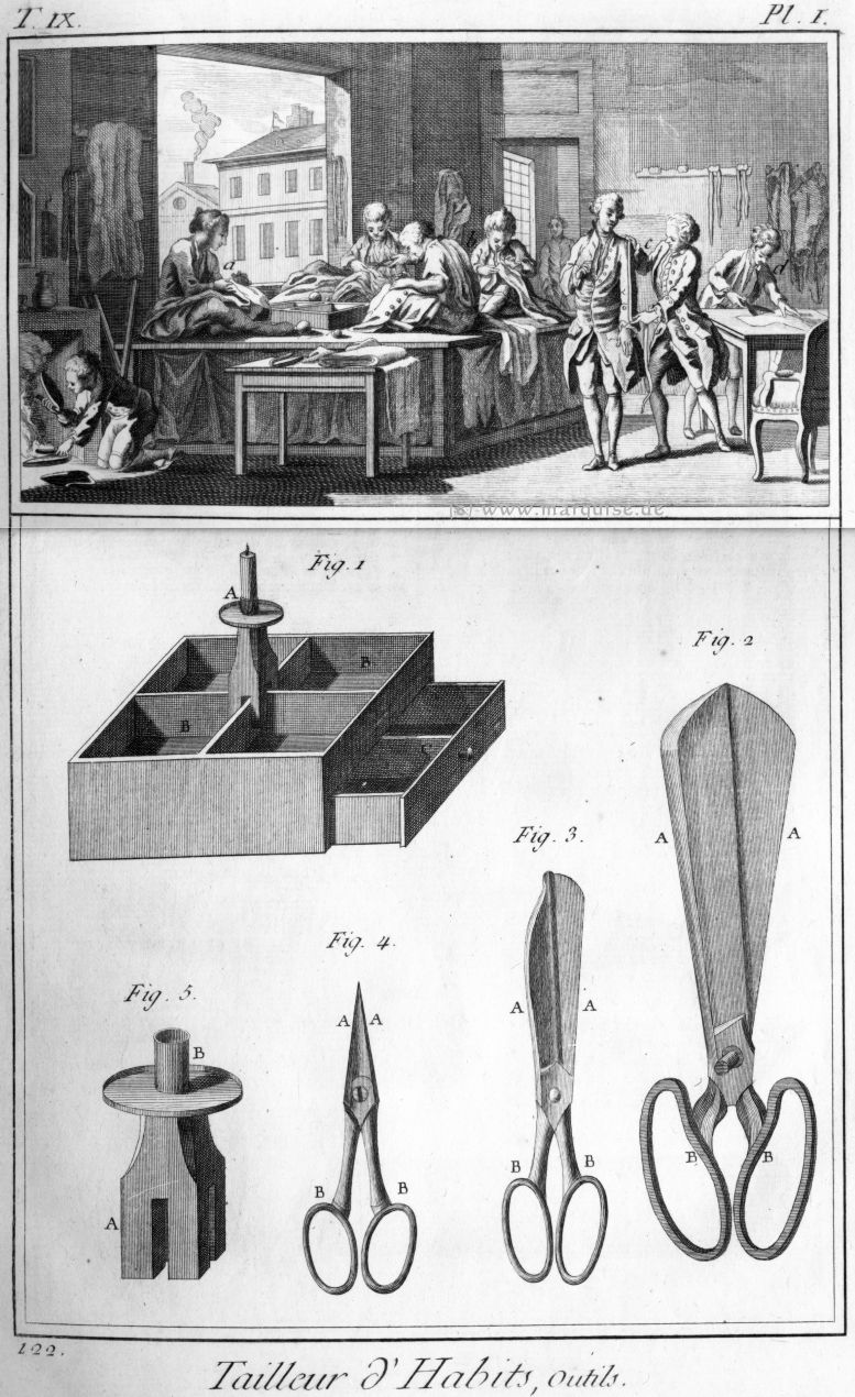 Im 18. Jahrhundert gab es zwei wichtige Werke, die uns Auskunft über Nähtechniken und Schitte der Zeit geben. Eines davon ist die Encyclopédie ou Dictionnaire raisonné des arts et métiers (Enzyklopädie oder alphabetisches Wörterbuch des Künste und Gewerbe) oder kurz "Die Encyclopédie" (1746-65), herausgegeben von Diderot, d'Alembert und anderen. Besonders interessant für die Kostümgeschichte sind die Tafeln des Abbildungsbandes Tailleur d'habits et Tailleur des Corps, die im folgenden vollständig wiedergegeben werden.