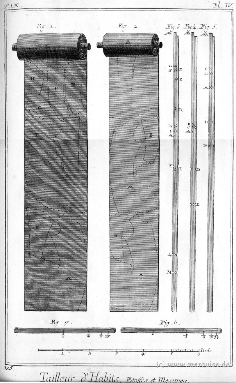Tafel 4: Stoffe und Maßbänder 1 Tuchballen von ca. 150 cm Breite mit aufgezeichneten Teilen eines Männeranzugs. Doppelt liegend auf einen Holzstock gerollt, die linke Seite oben; 2 Seidenballen, einfach liegend, von ca. 60 cm Breite. Was in der Breite fehlt, muß angestückelt werden; 3 Maßband des Rockes; 4 Maßband der Weste; 5 Maßband der Hose; 6 Elle, eingeteilt in Drittel, Sechstel, Zwölftel und 24stel; 7 dieselbe Elle von der anderen Seite, eingeteilt in Hälfte, Viertel, Achtel, Sechzehntel und je nach Bedarf noch andere Maße. Unten ein Vergleichsmaßstab in Fuß. Anmerkung: Maßbänder waren im 18. Jh. nicht mit Maßeinheiten markiert. Man legte die Papierstreifen beim Abmessen dem Kunden um und markierte Brust-, Taillen- Halsweite etc. darauf, indem man Keile hineinschnitt. Diese Maßbänder wurden für künftige Aufträge aufbewahrt. |
