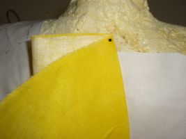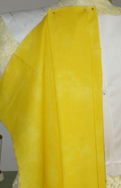 Ich zeige das wieder auf der Puppe, um Anpassungen an die Figur demonstrieren zu können, aber ich habe aber auch schon eine Robe komplett auf dem Fußboden drapiert. Die Figur-Anpassungen habe ich dann so gemacht, daß ich den Oberstoff möglichst glatt an das Futter angepaßt habe, weil weder Puppe noch Helfer zur Hand waren. Das Ergebnis ist zwar vielleicht nicht ideal, aber durchaus vorzeigbar.