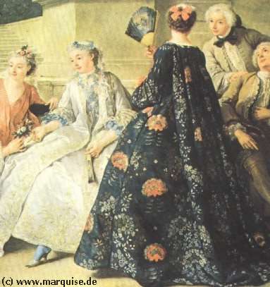 Ist die Robe für vor 1750/55 gedacht, ist sie damit eigentlich fertig. Für spätere Dekaden sollte unbedingt eine Garnitur aus Volants her. Dafür schneidet man möglichst lange und ca 4 cm breite Streifen mit der Zickzackschere (oder man zäckt sie aus) und legt sie entlang der Mitte in Quetschfalten oder reiht sie. Sie werden entlang der Vorderkante von Oberrock und Oberteil befestigt und laufen um den Nacken, wo sie die Oberkante der Watteaufalten abdecken. Man kann auch einige dieser Steifen in Wellen und Schnecken auf Ober- und Unterrock verteilen. Schau Dir ein paar Bilder an und laß Dich inspirieren!