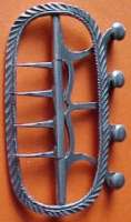 In das kürzere Endstück werden nun drei oder vier kleine, horizontale Knopflöcher gemacht (je nachdem, wieviele Knöpfe die Schnalle hat, und gerade so groß, daß die Knöpfe hindurchpassen), und die Binde ist fertig. Man legt sie über den hochgestellten Hemdkragen und verschließt sie hinten mit der Schnalle, deren Knöpfchen durch die Knopflöcher gesteckt werden. Deshalb muß ein Endstück länger und etwas schmaler sein als das andere, damit man es durch die Schnalle ziehen kann. Das übliche Material für Halsbindenschnallen scheint Silber gewesen zu sein (alle mir bisher bekannten sind aus Silber), aber wie bei Schuhschnallen sind auch Zinn, Messing und Stahl denkbar. Da aber vor allem wohlhabendere Herren Halsbinden dieser Art (und mithin Halsbindenschnallen) trugen, ist Silber als vorherrschendes Material plausibel. Die mit dem schwarzen Hintergrund oben - durch anklicken vergrößerbar - ist 925er Silber, der Rahmen 4,9 x 2,5 cm und das Maß über alles 5,1 x 3,2 cm.