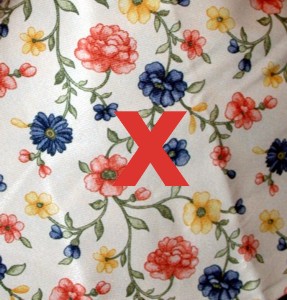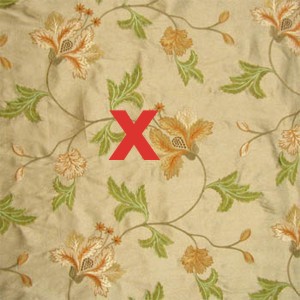 | Zu symmetrisch. Ein solches Stoffmuster wäre fürs mittlere 16. Jh. und ca. 1695-1710 vielleicht geeignet, wenn der Rapport nicht allzu groß ist (max. 25 x 25 cm), aber danach nur für Tapeten, Vorhänge und Möbel. Und nur in Seide. | Zu realistisch. Die Blüten haben Perspektive und sind stark schattiert. Im 18. Jh. sind Blüten stärker stilisiert. |