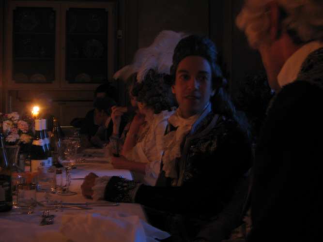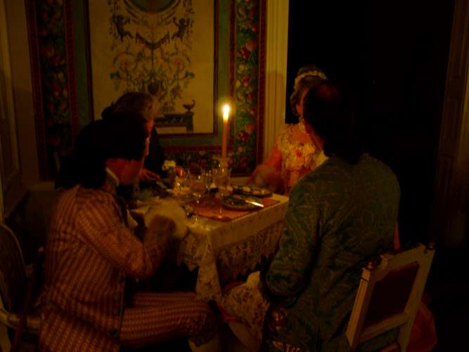 Dinner was served in the garden salon around 7 p.m. I cannot tell for certain since few of us wore a pocket watch. Unfortunately, the household was experiencing a shortage of servants so that the guests had to serve themselves. At least the cook had stayed! After dinner, the pary withdrew to the belle étage to listen to a recital. The music was bautifully performed by a soprano and a piano player, but apart from an aria or two by Maestro Händel, it was futuristic and had far too many notes in it. Composed by an Austrian baby named Wolfagang Amadeus, I was told, although how a baby could compose music, let alone write the notes, I was unable to learn.
