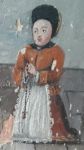 Die gleiche Komposition, die gleiche Ex-Voto-Plakette mit der gleichen Schrift darin. Das Wenige, das man vom Gnadenbild sieht (kommt davon, wenn man auf Klamotte fokussiert ist) scheint auch gleich zu sein. Daraus schließe ich, daß sie aus der gleichen Werkstatt stammen, vielleicht vom gleichen Maler. Die beiden äußeren zeigen die gleiche Tracht; 1772 noch sehr unbeholfen, 1779 schon besser. Bei der mittleren sehen Rock und Rosenkranz genau wie bei den anderen aus, nur der Oberkörper und der Kopfputz sind anders. Wenn sie aus dem gleichen Jahrzehnt und aus dem gleichen Ort stammen — warum ist dann Eine anders gekleidet?