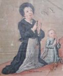 Eigentlich schon außerhalb des Zeitrahmens, aber es zeigt, wohin bei den Hauben die Reise geht – und bei den rot-blau-Kombinationen. wie beim Kind aus dem vorigen Bild ein braunes Kleid mit kleinteiligem, hellem Muster. 1822