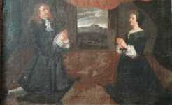 Beffchenähnliche Kragen bei Frauen finden sich vom späten 17. bis zum mittleren 18. Jh. (siehe Familie von 1742). Für eine Haube scheint die Kopfbedeckung der Mutter zu voluminös und kugelig, aber vielleicht konnte es der Maler einfach nicht besser. 1722 Noch häufiger als Schleier sieht man an Familienmüttern schwarze Hauben – aber oft auch an den Töchtern. Ein Hinweis auf den Familienstand sind sie also nicht. Der Maler wollte wohl schwarze Spitze andeuten; Vatern trägt Perücke: Eine wohlhabende Familie. 1742