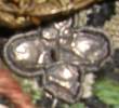 (Plasch)Auch Lahn wird für flächige Elemente benutzt. Lahnstickerei kann über eine Pappunterlage wie bei Kantillen geführt werden, über eine Unterlage aus dickem Leinengarn, oder flach aufliegend. Letzteres ist am einfachsten. Schneide ein reichliches Stück Lahn ab - so viel, wie Du voraussichtlich für das Musterteil brauchst - und knicke 1-2 mm nach hinten. Stich am unteren linken Eck des Musterteils nach oben, führe den Faden durch das nach hinten geknickte Stück, und stich am unteren linken Eck wieder nach unten. Stich am unteren rechten Eck wieder nach oben, lege den Lahn nach rechts, führe den Seidenfaden über den Lahn und stich nach unten. Stich links nach oben, lege den Lahn nach links... und so geht es im Zickzack weiter bis zum Ende des Musterteils. Soll der Lahn glatt aufliegen, streiche die Wendepunkte platt.(Bild links)