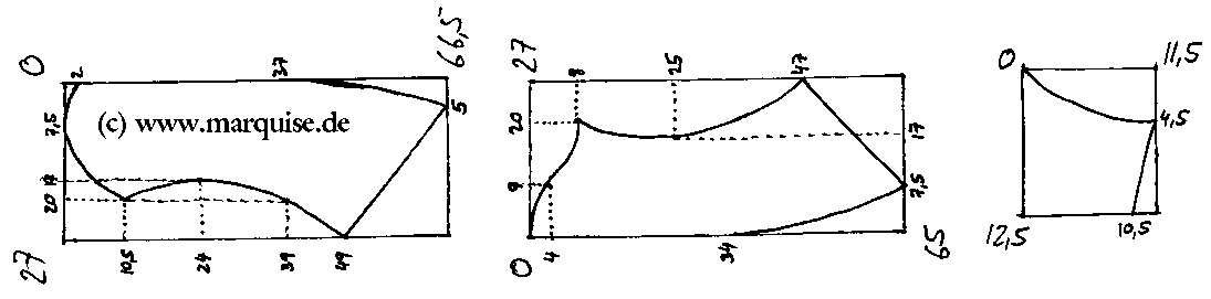 The hem line of the justaucorps has probly suffered most. It should be a smooth curve, every point being 60 cm away fromt the small curve at waist level. If necessary, correct it in the full-size pattern. Give at least 5 cm seam allowance round the hem.