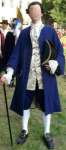A man's 18th century suit consists of breeches, waistcoat and coat (=justaucorps). Unlike the modern coat, the 18th coat is not an optional garment for outdoor use only, but an integral part of the suit without which a gentleman wasn't properly dressed. With a shirt, stock and overknee stockings, the man was fit for the public. The basic technique for making a suit was the same for all of the 18th century, with one exception: Until about 1750, the breeches usually buttoned in the centre front, whereas later, fall-front breeches (culotte à la bavaroise = Bavarian-style breeches) became fashionable, probably because it looked better with the shorter waistcoats of the time. For the later (1770s/80s) styles, there is a number of commercial patterns available from suppliers that cater to American War of Independence reenactors. For earlier styles, there isn't much to be found yet, so I was happy to find a guinea pig for a 1750s suit. The results can be seen below.